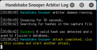Three additional windows will appear periodically. If a handshake is captured, i.e. the attack was completed with success, then such an entry will appear in one of the windows, and the other windows will be closed and the attack will be stopped: