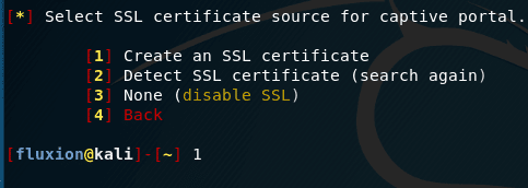 If you have a personalized certificate, you must save it to fluxion / attacks / Captive Portal / certificate / server.pem and the attack will automatically detect it and select it.