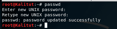 You will see a shell prompt, also note that we are logged in as root , i.e. we have elevated privileges, including the use of the passwd command :