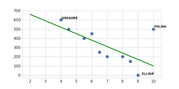 Let’s get back to our example. It seems to the eye that the two parameters are somehow interconnected: the less the person slept, the more he will drink coffee the next day. At the same time, we also have an example that stands out from this trend – Polina, a lover of sleeping and drinking coffee. Nevertheless, you can try to approximate the resulting pattern with a certain common straight line so that it fits as close as possible to all points: